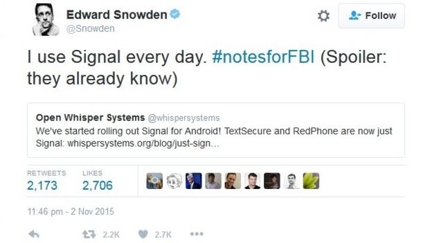“Uso o Signal todos dos dias (Spoiler: o FBI já sabe)”, disse Snowden no Twitter.