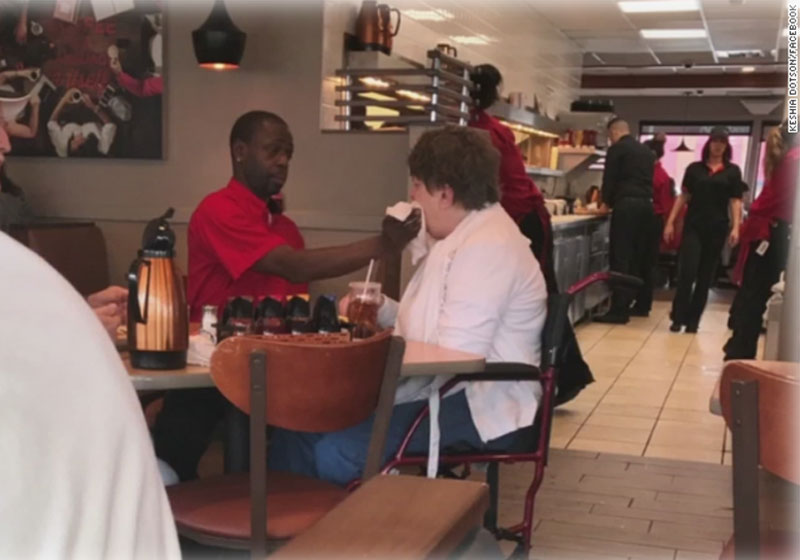 A foto que mostra a bondade de um garçom, dando comida na boca de uma cliente deficiente, está rodando o mundo.